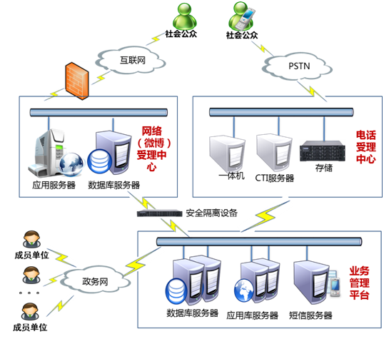 部署采用集中部署,建立統(tǒng)一的呼叫中心,負(fù)責(zé)所有電話的受理,對于呼叫中心無法處理的問題,形成電子工單,分派到各下級單位處理。網(wǎng)絡(luò)受理中心系統(tǒng)和微博受理中心系統(tǒng)共用應(yīng)用服務(wù)器和數(shù)據(jù)庫服務(wù)器,考慮問題,網(wǎng)絡(luò)(微博)受理中心與業(yè)務(wù)管理平臺服務(wù)器之間將通過隔離設(shè)備進(jìn)行隔離。